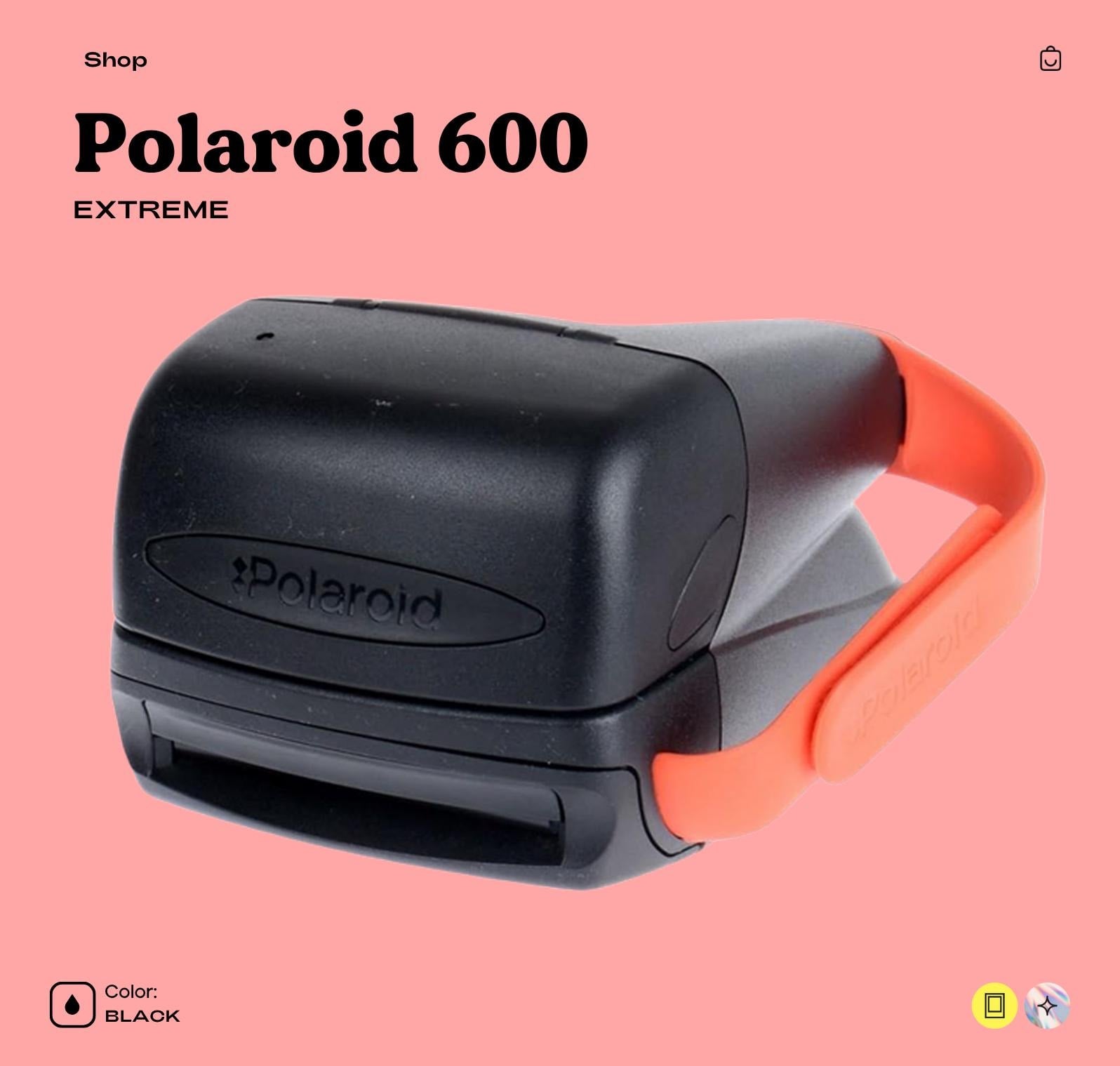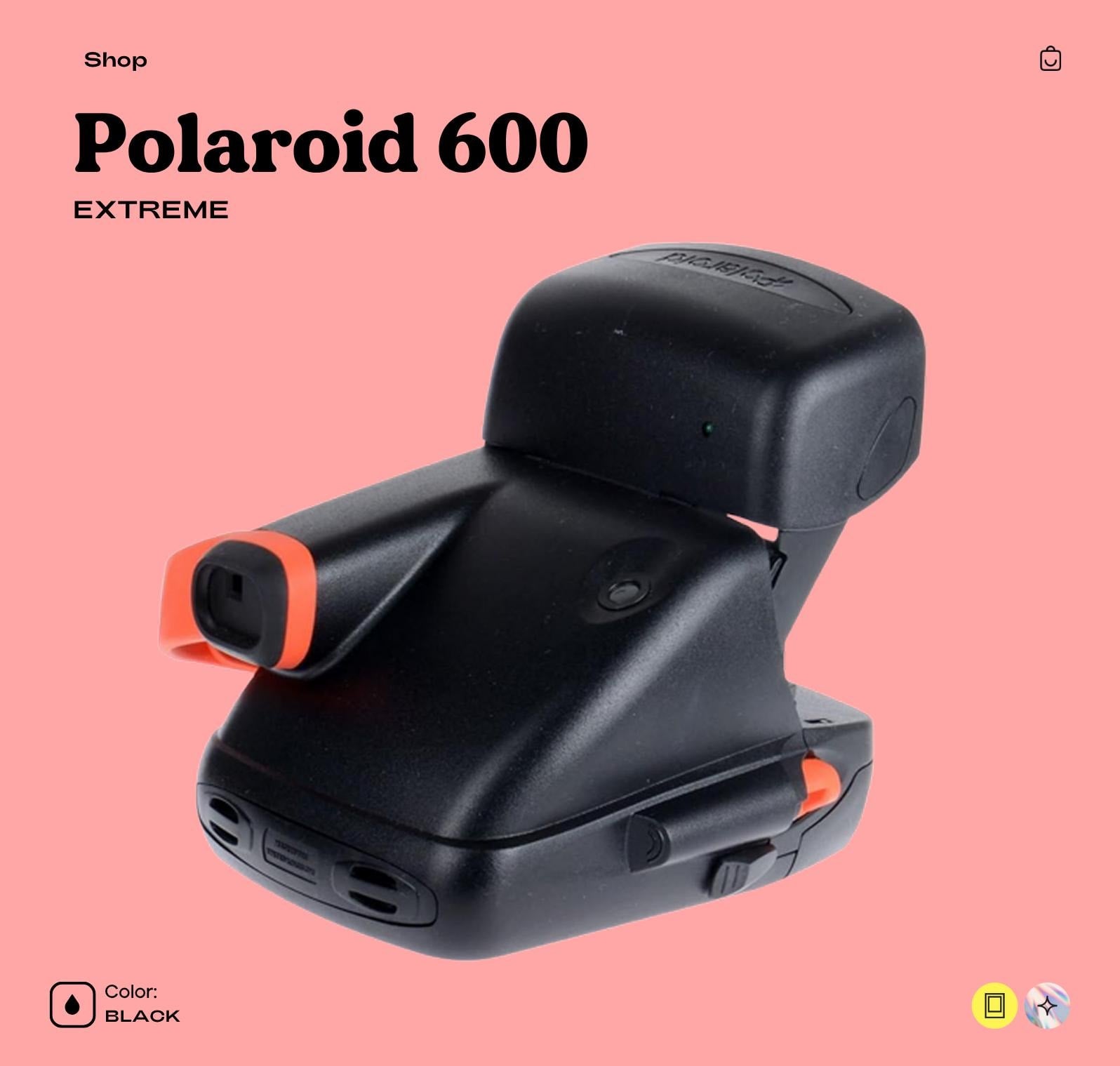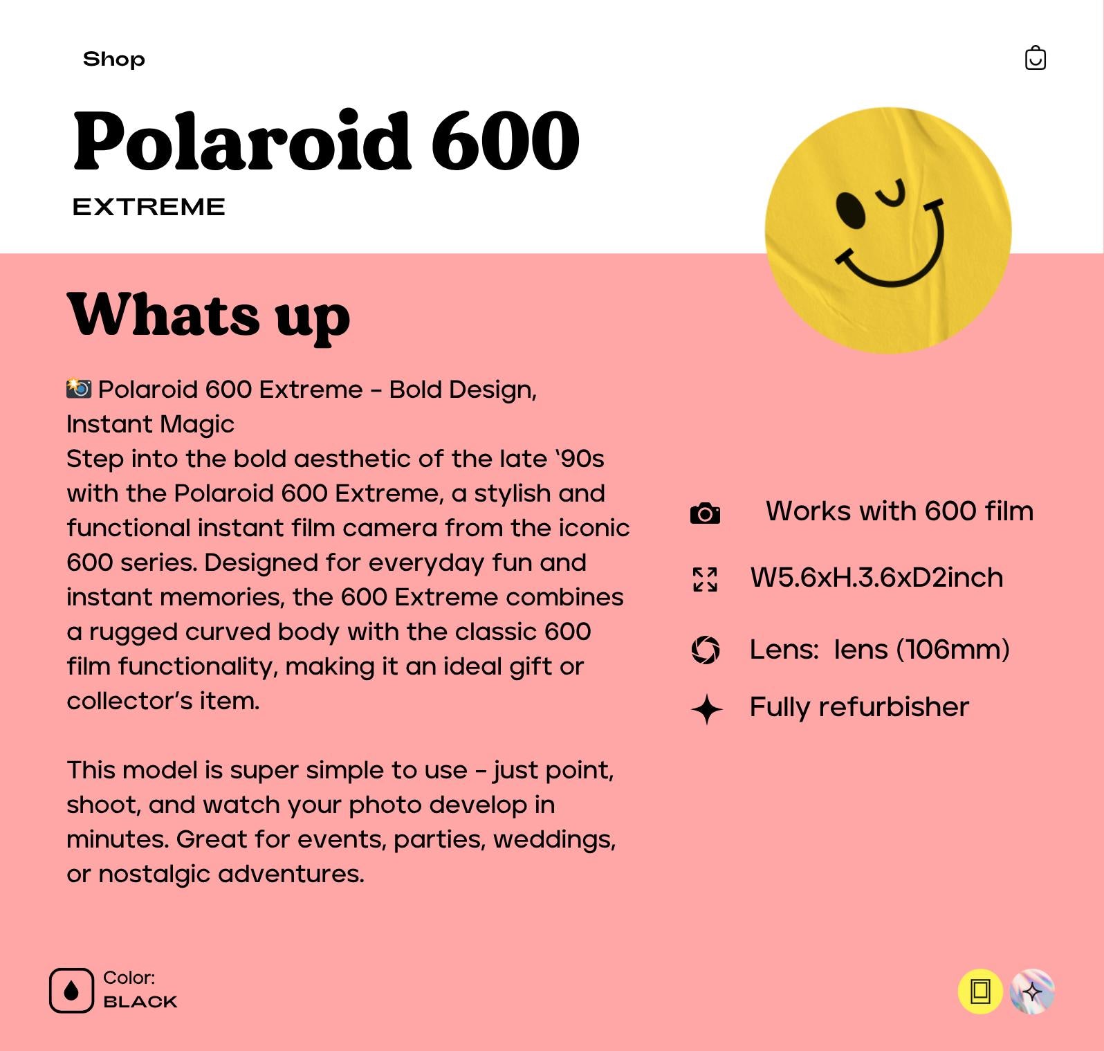 Polaroid 600 Extreme – Bold Design, Instant MagicStep into the bold aesthetic of the late ‘90s with the Polaroid 600 Extreme, a stylish and functional instant film camera from the iconic 600 series. Designed for everyday fun and instant memories, the 600 Extreme combines a rugged curved body with the classic 600 film functionality, making it an ideal gift or collector’s item.This model is super simple to use – just point, shoot, and watch your photo develop in minutes. Great for events, parties, weddings, or nostalgic adventures.🔍 Key Features: 📸 Lens: Fixed-focus lens (106mm)🔦 Flash: Built-in automatic flash📏 Focus Range: 4 ft (1.2m) to infinity🌤️ Exposure: Lighten/Darken slider🧠 Viewfinder: Direct optical viewfinder🎞️ Film: Uses Polaroid 600 film (sold separately)🔋 Battery: Included inside each film pack📐 Size & Weight: Width: 4.9 in (12.5 cm)Height: 5.6 in (14.2 cm)Depth: 6.2 in (15.7 cm)Weight: Approx. 700g🛠️ Condition: Fully tested and workingClean optics & viewfinderFlash tested and firesBody in good vintage cosmetic conditionComes ready to use – just insert a 600 film pack!🎁 Perfect For: Retro camera collectorsInstant photo loversVintage decor or propWeddings, travel, and creative photography